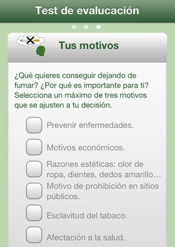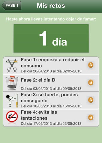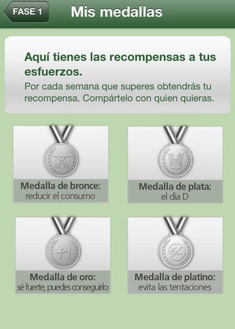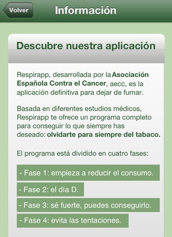 Respirapp ofrece los consejos y herramientas necesarias para todo el proceso de dejar de fumar de manera que no recaigas en el futuro. A través de mensajes de apoyo y medallas virtuales, Respirapp te incentivará en seguir las cuatro fases del proceso.